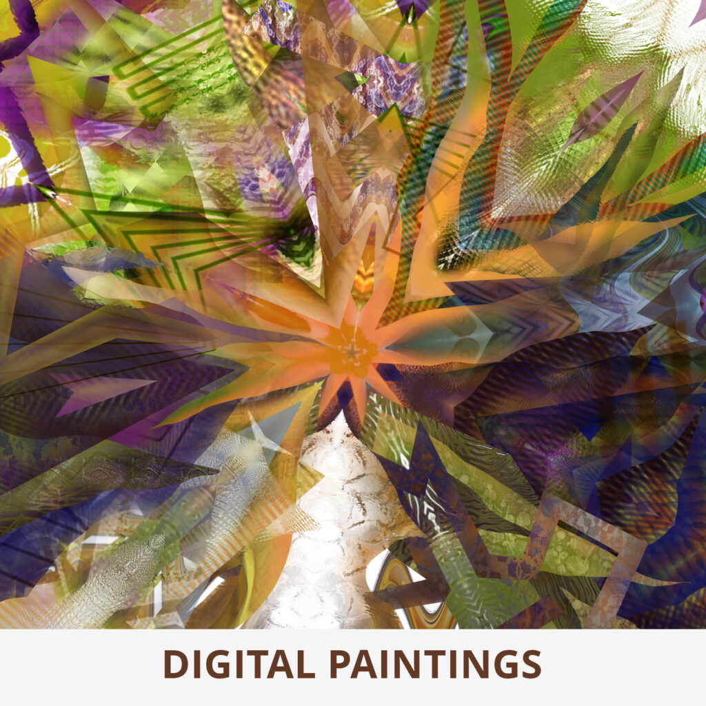 I was introduced to computers in 1981 and quickly became interested in coding my own still and animated graphics; first on early Apple and HP personal computers, later on an Atari 1200XL computer. In the early 1990s I purchased my first Macintosh computer and began using paint programs to create digital paintings. I currently use a variety of “off the shelf” apps, along with writing my own software in my art making processes.